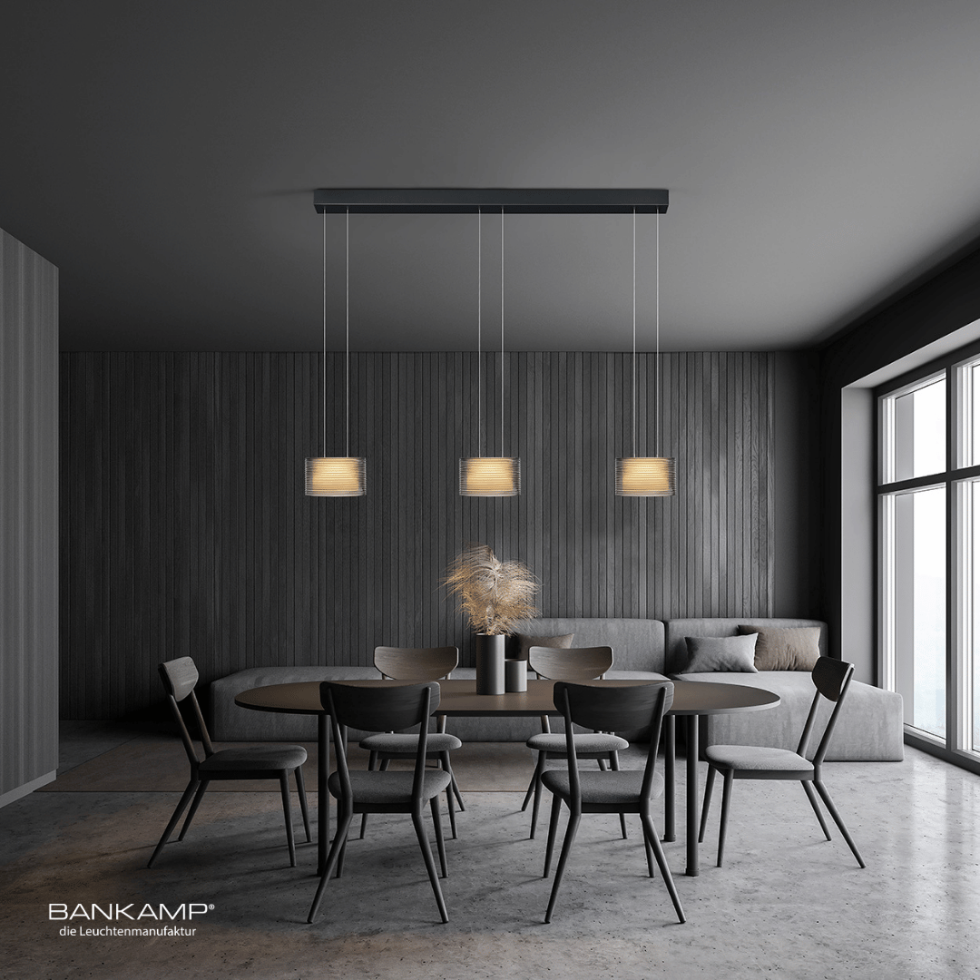 Die 3er-Pendelleuchte Grand sorgt mit ihren drei Pendeln für eine beeindruckende Lichtgestaltung in großen Räumen oder über Esstischen. Mit einer Leistung von 57 W und einer Lichtstärke von 5100 Lumen bietet sie eine hervorragende Ausleuchtung und kann über die Vertical-Dim-Funktion an die gewünschte Raumstimmung angepasst werden. Die Leuchte ist in verschiedenen Varianten erhältlich und lässt sich perfekt mit weiteren Produkten der Grand Serie kombinieren, um eine durchgängige Lichtlösung zu schaffen. Optional können diese Leuchten auch über Dali oder Casambi gedimmt werden, dies ist als Sonderanfertigung möglich.
